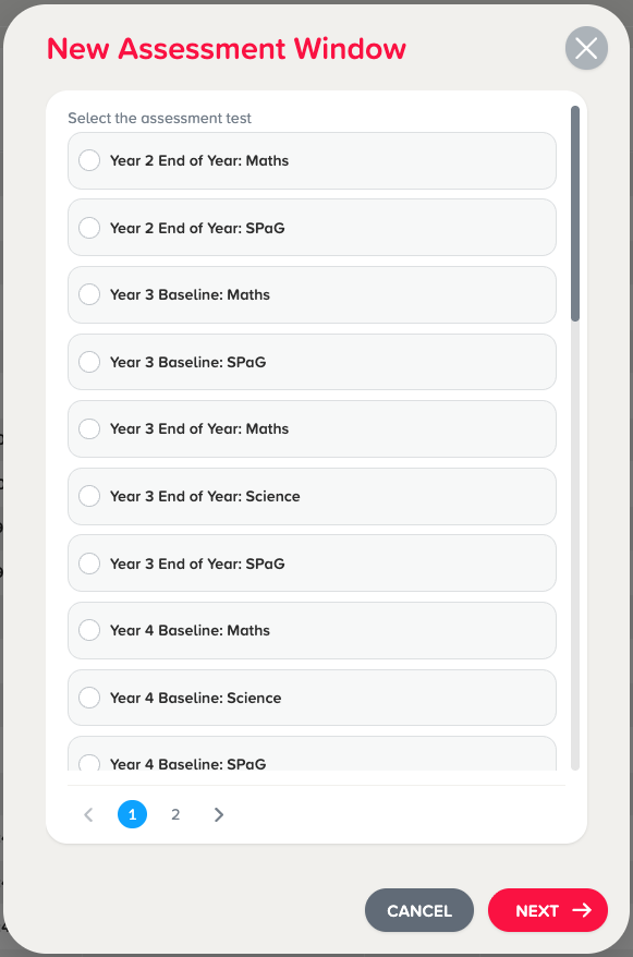 Click on the ‘New Assessment Window’ button. There will be multiple forms available for the assessments we are Item Trialling. Where this is the case, please select one assessment form per class, then click ‘Next’.