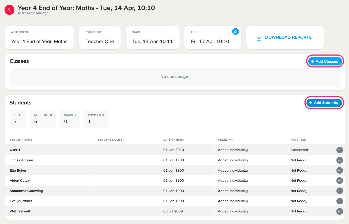 You will then be taken to the Assessment Manager page. Click on the 'Add Classes' or ‘Add Students’ button, where you can select from all students or classes from within your organisation. Then, click ‘Add’.