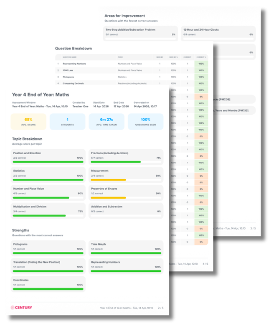 CENTURY’s Year Group Primary assessments measure learners against the expected standards for each specific year group. Our End of Year Assessments are designed to be sat at the end of the academic year to capture learner progress. These assessments align to the English National Curriculum for English (grammar, punctuation and spelling), maths and science.
